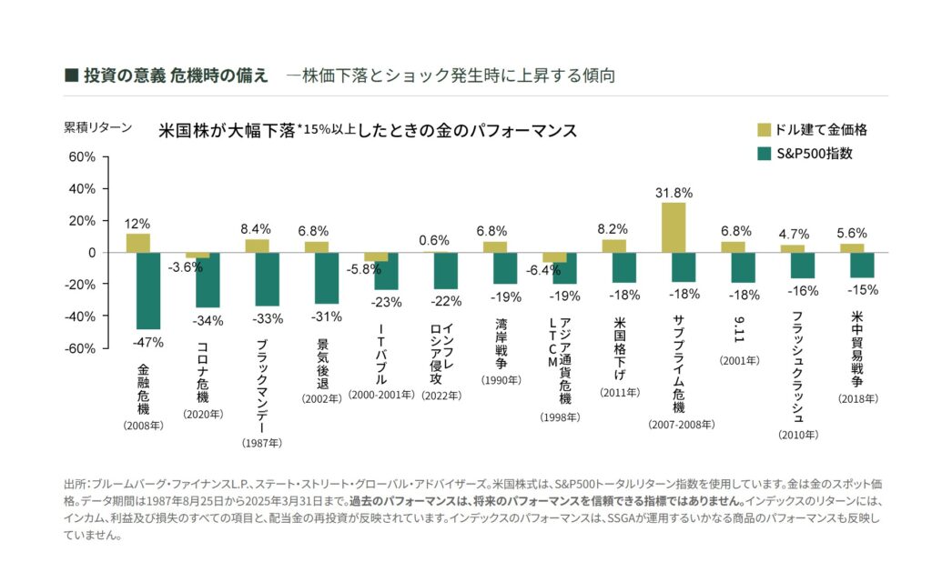 上の表でも分かるように株価が下落した場合でも金は安定しており、このような事から”有事の金”と言われポートフォリオの中に金資産をいれておくと、株価下落時に試算が安定する。