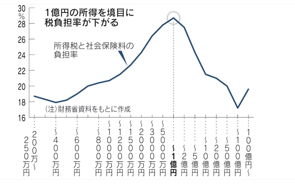 年収1億以上になると税金の負担率が下がるという現象だが、これは年収1億以上の人のほとんどが、給与所得(税率55%)よりも金融所得(課税率20%)からの収入が多くなる事で税率が下がるという現象だ。