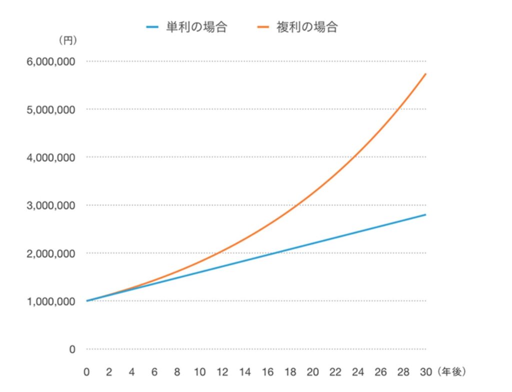 元本に加えて利息にも利息がつく仕組みで、長期的に資産が雪だるま式に増えていくためである。