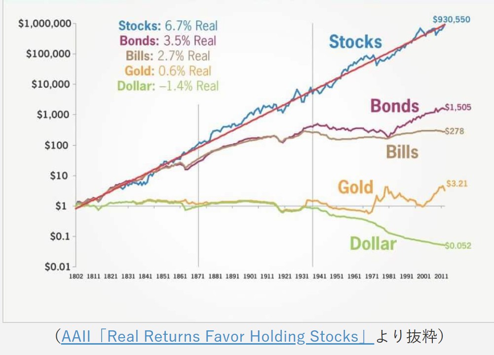 これは投資をしている人にとってはかなり有名な表で、過去200年間におけるアメリカの各資産の価値の推移を示した研究結果だ。
