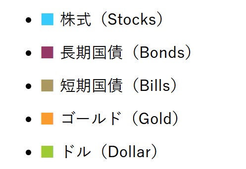 「1800年に1ドルずつ各資産に投資したら2013年にはどうなっていたか?」が分かる。