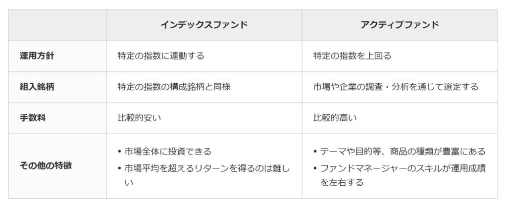 投資信託にはインデックスファンドとアクティブファンドという種類がある。