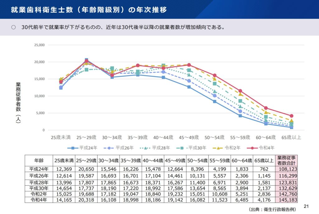 歯科医師と違い60歳を超え働く歯科衛生士は減るが、50代まで就労歯科衛生士は均一である。
