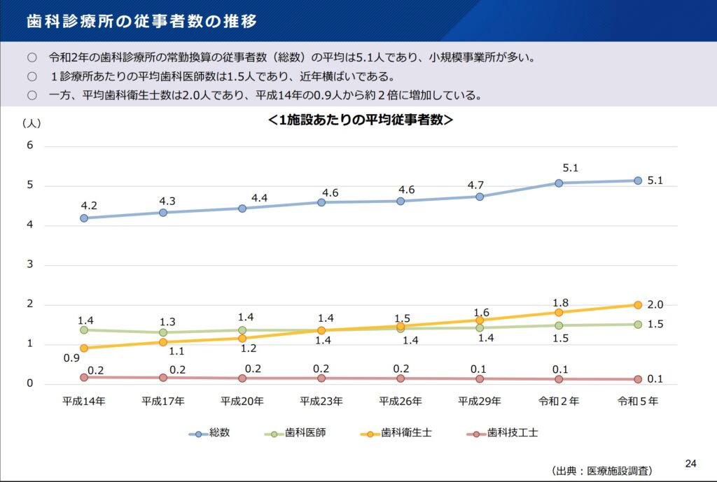 これは日本という国が経済低迷しており共働きが増えた事や、女性にも働きやすい歯科医院が増えた事が理由になっていると考えられる。