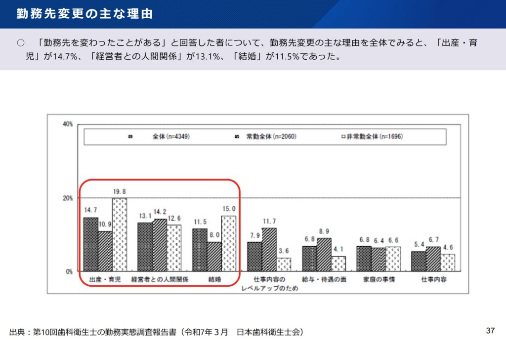 歯科衛生士が転職する理由は「結婚出産や経営者との人間関係」が大部分を占めている事が分かる。