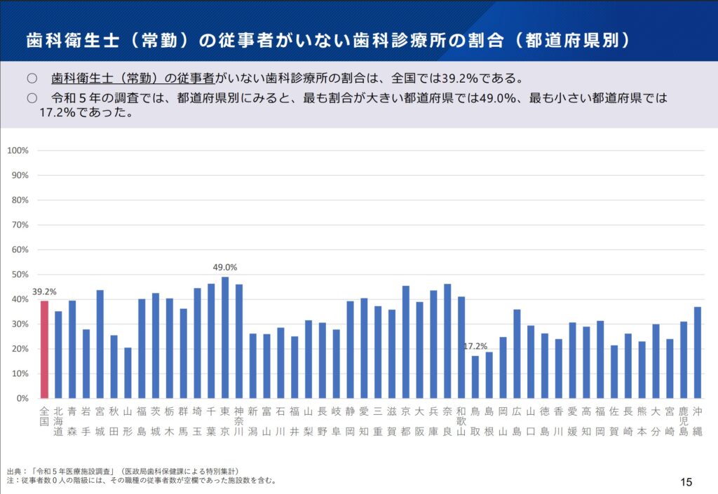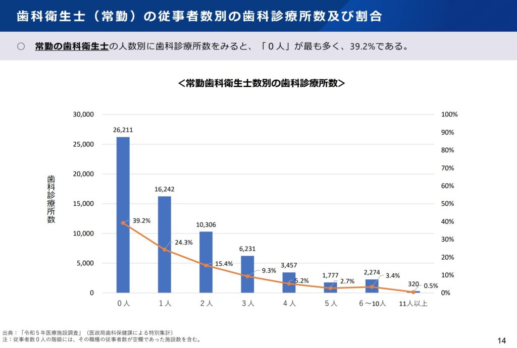 常勤歯科衛生士が0、1人の歯科医院が63%も存在する。