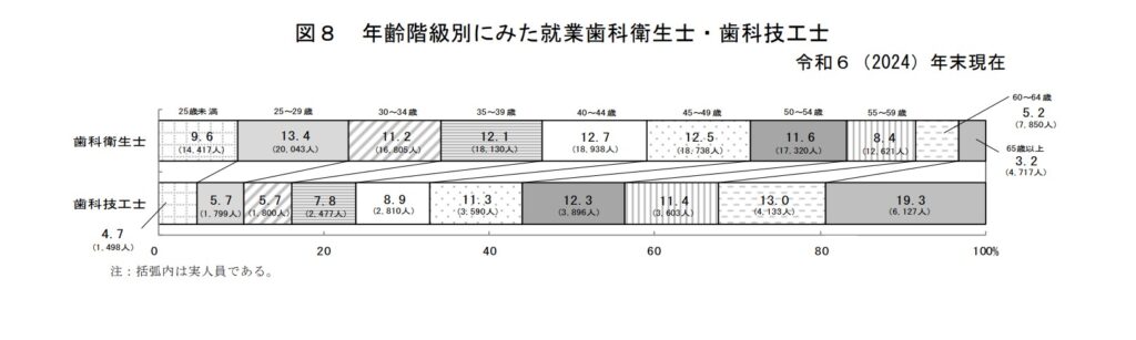 歯科衛生士は全世代が満遍なく存在しており、歯科医師のような高齢化は見られない。