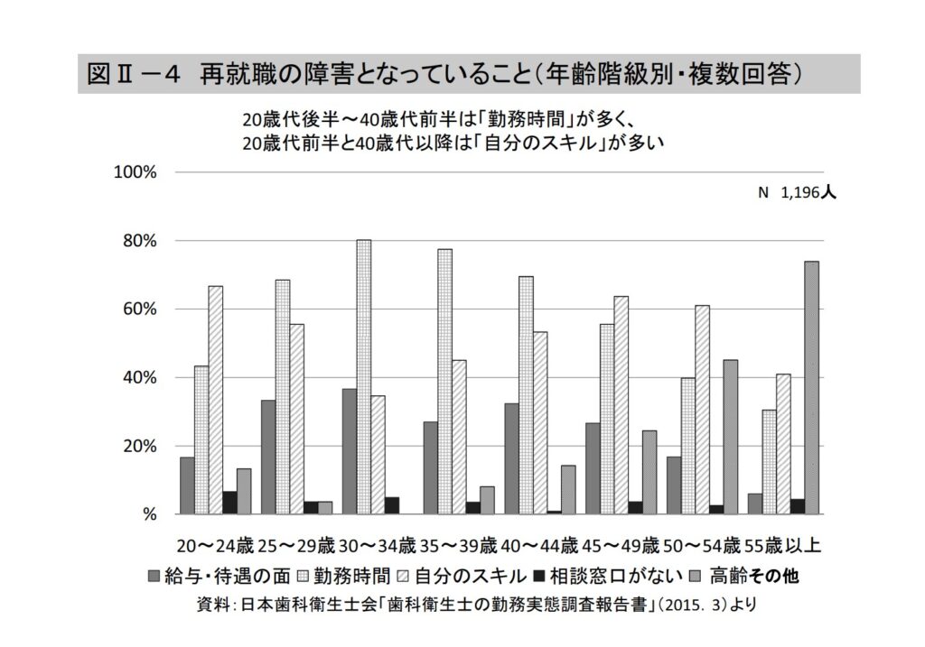 結婚、出産で30代前半で一時的に就職率は下がるが、30代後半以降は就職する歯科衛生士は増加する。